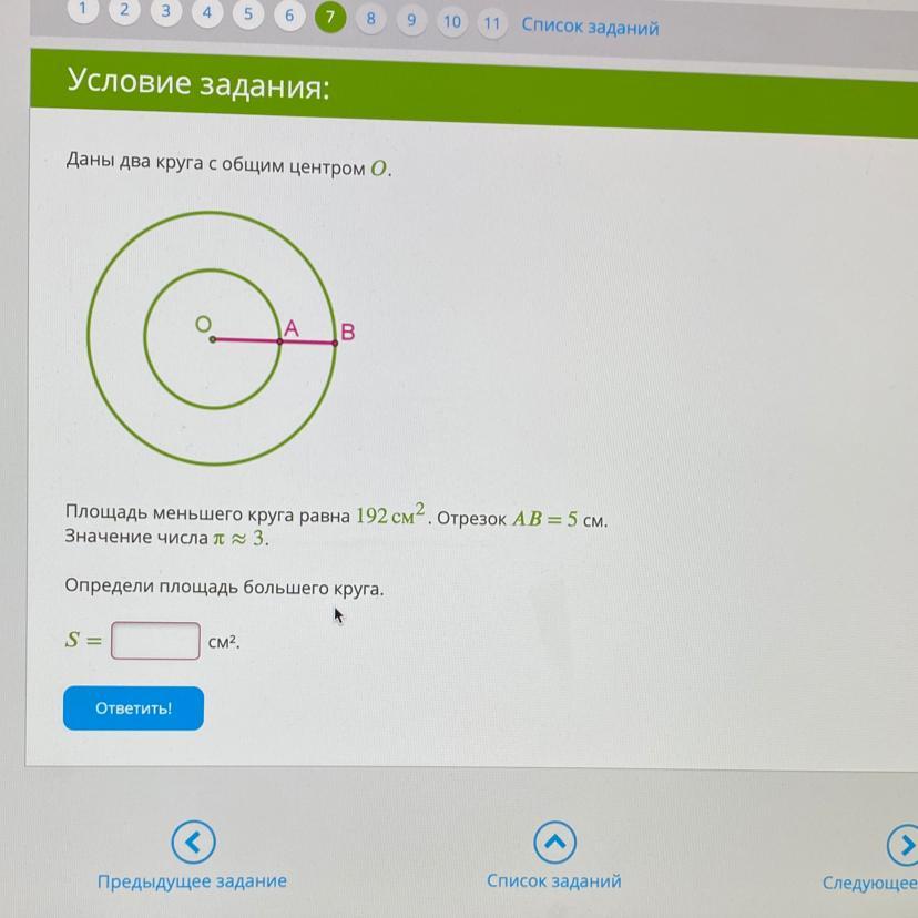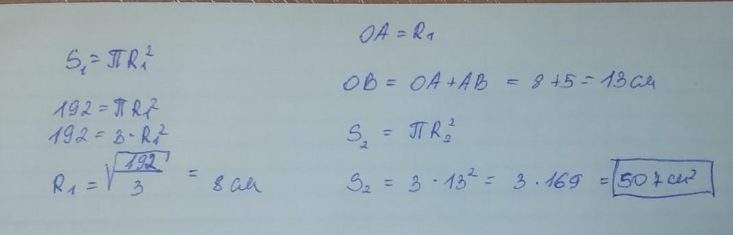Площадь меньшего круга равна 192 см2. Отрезок АБ = 5 СМ. Значение числа p≈3 определи площадь большего круга