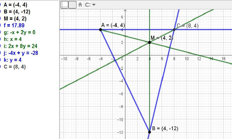 Задані дві вершини трикутникаABC: A(−4, 4), B(4, −12) і точка M(4, 2) перетину його висот. Знайти координати вершини C .