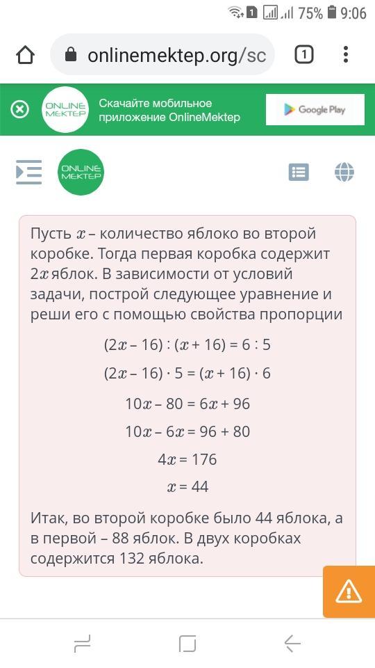 В первой коробке яблок было вдвое больше, чем во второй. Аружан взяла из первой коробки 16 яблок и положила их во вторую. Тогда соотношение количества яблок в первой коробке ко второй стало 6:5. Найди количество яблок в двух коробках.