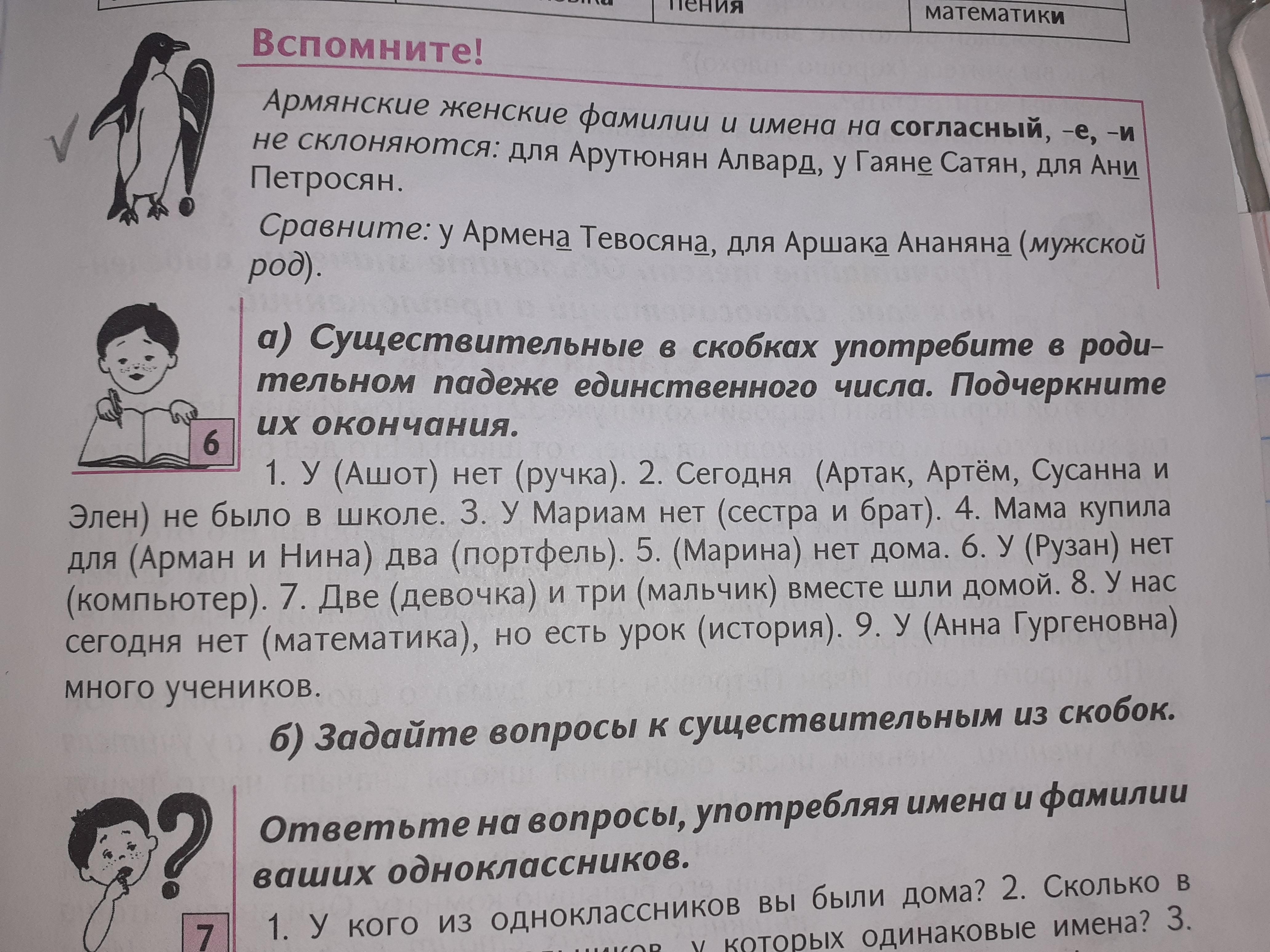 у Ашота нет ручки. сегодня артакА,артемА....не было в школе.у мариам нет сетры и брата. мама купила доя армана и нины 2 портфеля. марины нет дома. у рузаны нет компьютера. 2 девочки и 3 мальчика шли вместе домой. у нас сегодня нет математики,но естт урок истории. у анны гургеновы много учеников
