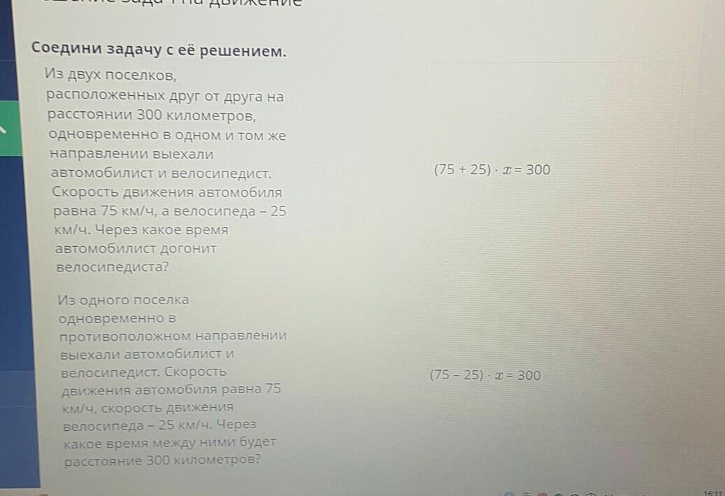 (75-25)×Х=300- к первой задаче; (75+25)×Х=300- ко второй задаче, где авто и велосипед движутся в разных направлениях.