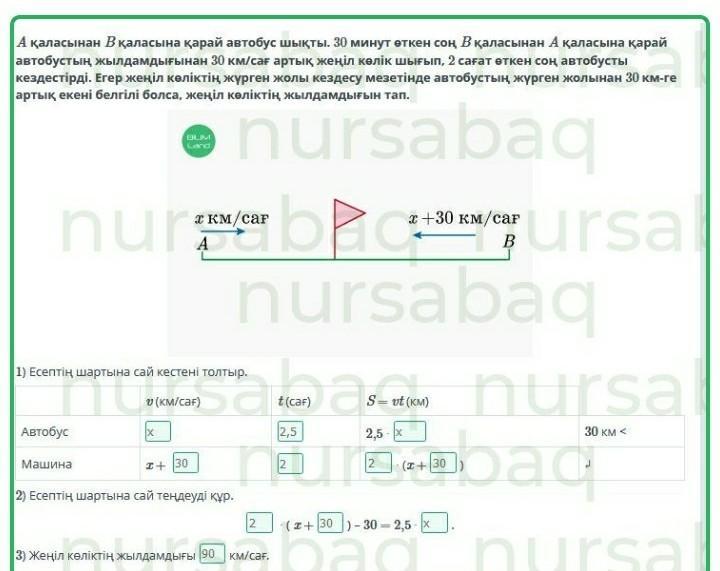 A қаласынан B қаласына қарай автобус шықты. 30 минут өткен соң B қаласынан A қаласына қарай автобустың жылдамдығынан 30 км/сағ артық жеңіл көлік шығып, 2 сағат өткен соң автобусты кездестірді. Егер жеңіл көліктің жүрген жолы кездесу мезетінде автобустың жүрген жолынан 30 км-ге артық екені белгілі болса, жеңіл көліктің жылдамдығын тап.