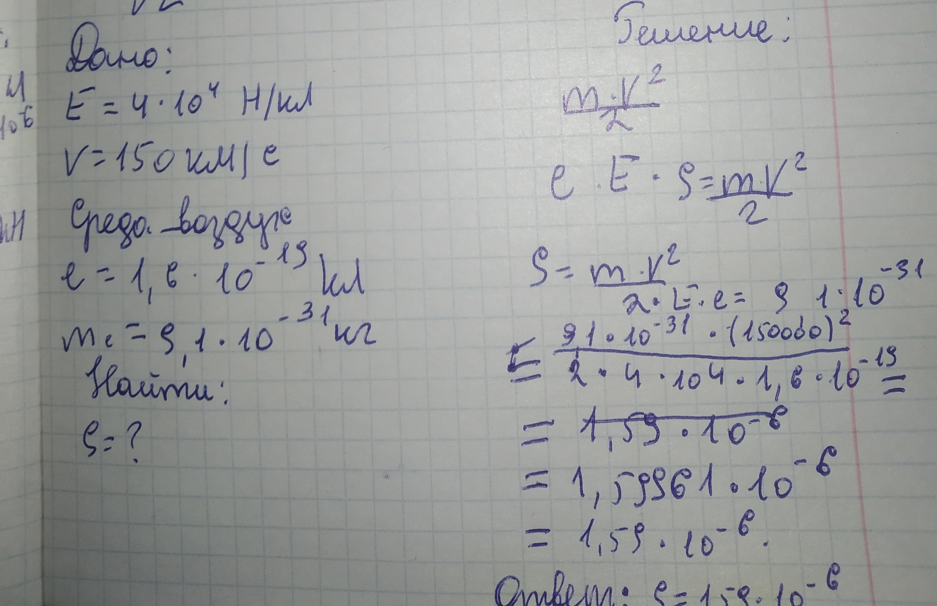 Электрон движется без начальной скорости вдоль силовой линии однородного электрического поля напряжённостью Е=4•10^4 Н/Кл. Какой путь S он пролетит прежде, чем его скорость станет v=150км/с? Среда-воздух. Модуль заряда электрона е=1.6•10^-19 Кл. его масса m=9.1•10^-31 кг.