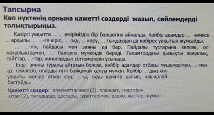 Қазіргі уақытта әлеуметтік желі өміріміздің бір бөлшегіне айналды.Кейбір адамдар смортфон немесе планшет арқылы әлеуметтік желі не кіріп,кітап оқу,жұмыс көру,радио тындаудан көбірек уақытын жұмсайды.