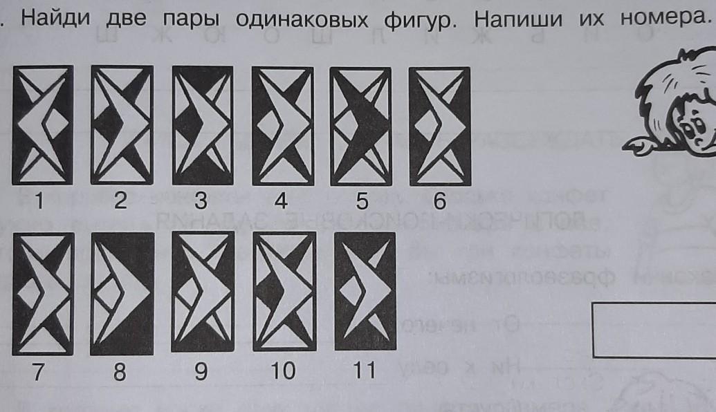 пожалуйста:Найди две пары одинаковых вигур.Напиши их номера