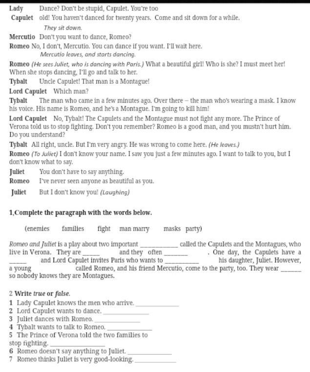 Ответ: Номер 1 : 1 enimies, 2 families, 3 fight, 4 party, 5 marry, 6 young man, 7 masks