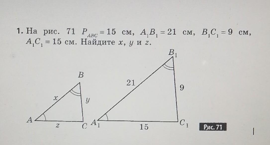 На рис. 71 Р. = 15 см, А.В. = 21 см, В.С. = 9 см, АС, = 15 см. Найдите х, у и z.