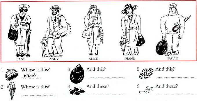 Example: Jane has got black shoes, round glasses, a funny hat, a black bag and a long umbrella.