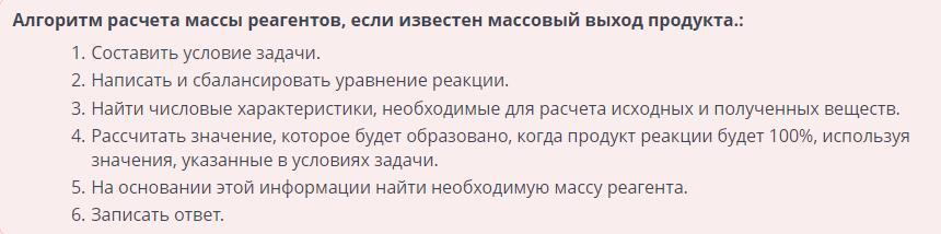 Установи алгоритм расчета массы реагентов, если известен массовый выход продукта.