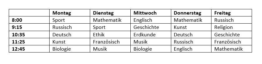 8:00 Sport Mathematik Englisch Mathematik Russisch
