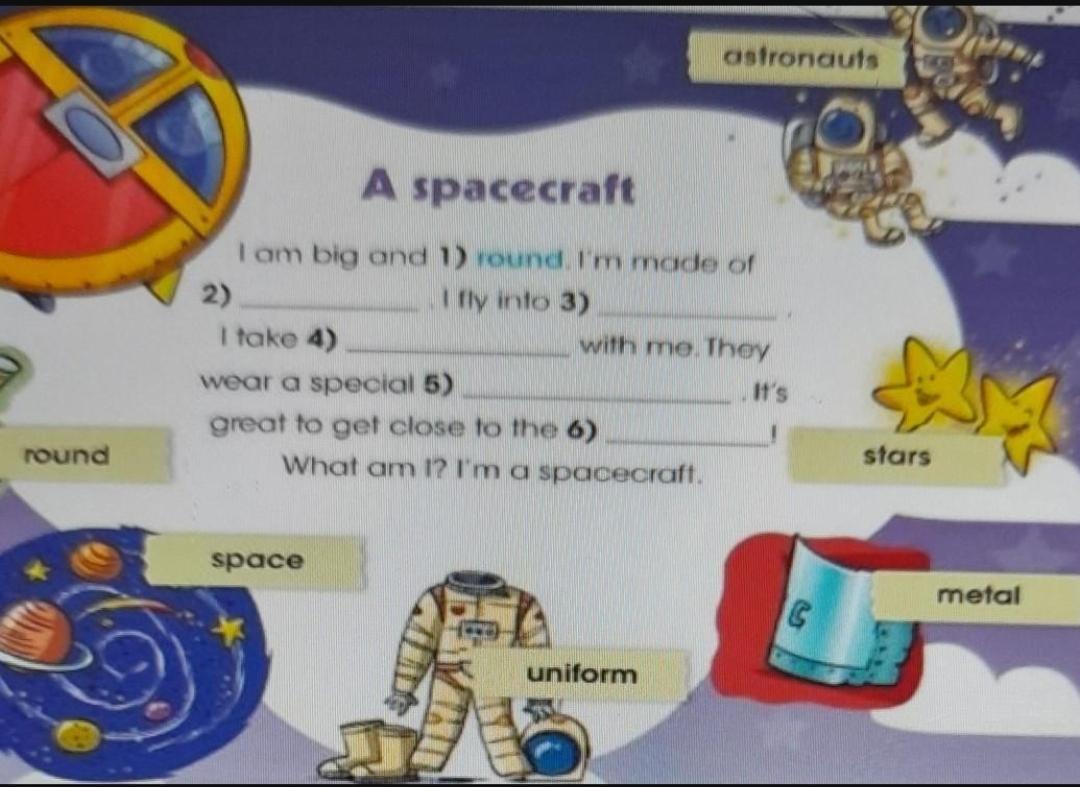 2 Read, choose and complete. astronauts A spacecraft Tam big and 1) round. I'm made of I fly into 3) with me. They . It's 2) I take 4) wear a special 5) great to get close to the 6) What am I? I'm a spacecraft. space round stars metal uniform 58 Cover this page after page 79 of the Pupil's Book.