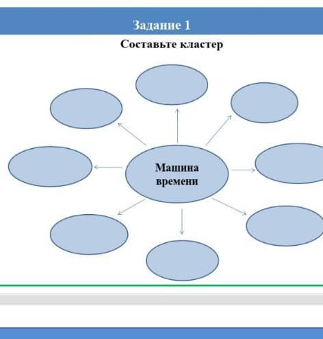 Кластер — это форма организации материала графическим способом. В центре схемы располагается основное понятие, а с разных сторон написаны ассоциации, идеи, словосочетания, предложения, связанные с этим понятием. В данном задании в центре находится сочетание "машина времени".