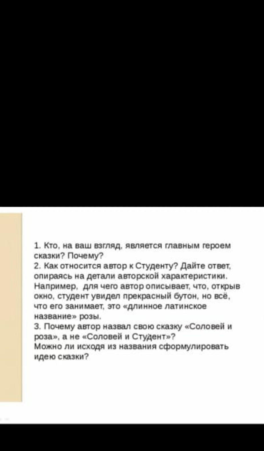 1. Я думаю что главным героем сказки является соловей, ведь он бесстрашно отдал свою жизнь ради розы