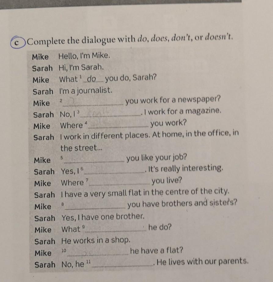 Complete the dialogue with do, does, don't, or doesn't.