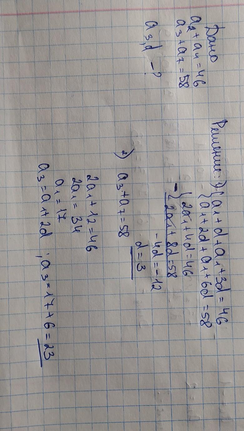 В арифметической прогрессии сумма второго и четвёртого членов равна 46, а сумма третьего и седьмого членов равна 58.Найдите третий член и разность прогрессии.