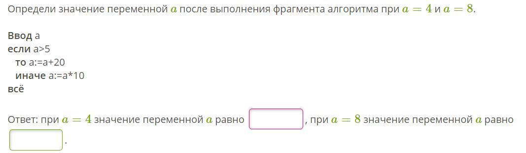 при а = 4 значение переменной а равно 40, при а = 8 значение переменной а равно 28