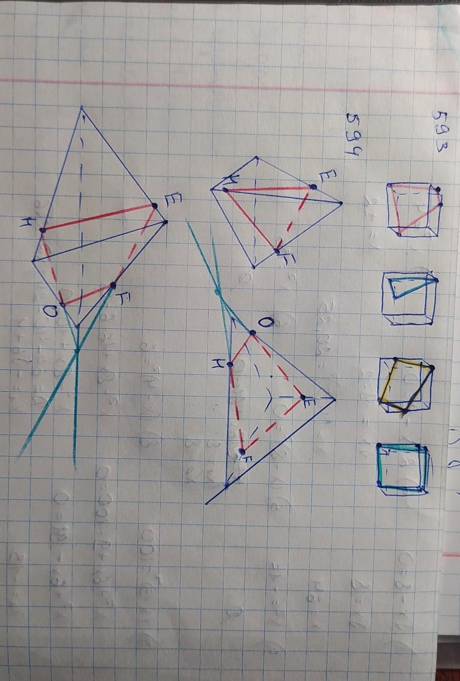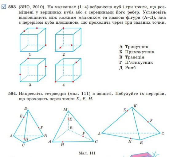 номер 593: 1 В, трапеция, так как если дорисовать перериз, то там ещё одна точка упадет к вершине