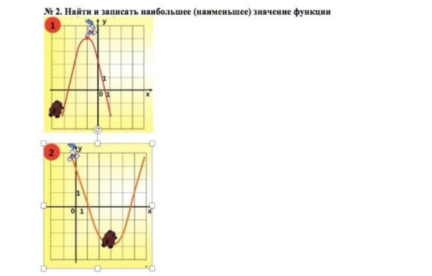 Наибольшее значение - это точка, где функция перестает возрастать и начинает убывать ("горб" на графике). Наименьшее - где перестает убывать и становится возрастающей ("яма").