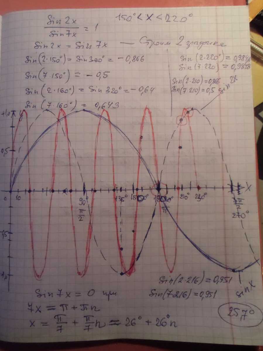 Сумма корней( или корень, если он единственный) уравнения sin2x/sin7x=1 , удовлетворяющих условию 150 градусов < x < 220 градусов , равна