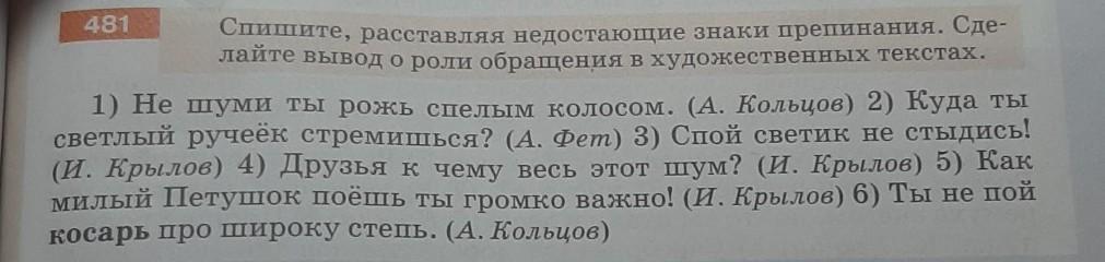 #481. Спишите, расставляя недостающие знаки препинания. Сделайте вывод о роли обращения в художественных текстах. , помагите пожалуйста