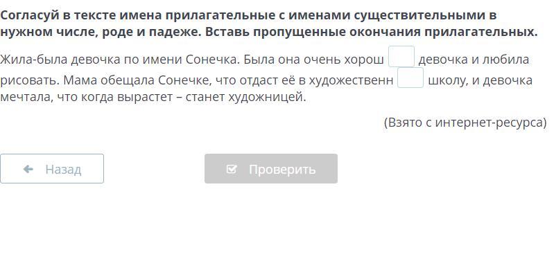 согласуй в тексте имена прилагательные с именами существительными в нужном числе, роде и падеже. Вставь пропущенные окончания прилагательных. Жила-была девочка по имени Сонечка. Была она очень хорош... девочка и любила рисовать. Мама обещала Сонечке, что отдаст её в художественн... школу, и девочка мечтала, что когда вырастет – станет художницей.