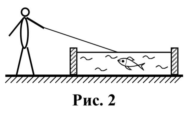 В торговом центре установили большой декоративный бассейн, в котором плавают рыбы (см. рис. 2). Хулиган, праздно шатающийся по коридорам торгового центра, достал из кармана лазерную указку и попытался осветить лазерным лучом рыб. Как хулиган должен целиться, чтобы попасть лазерным лучом в рыбу–выше, ниже или точно в видимое изображение?