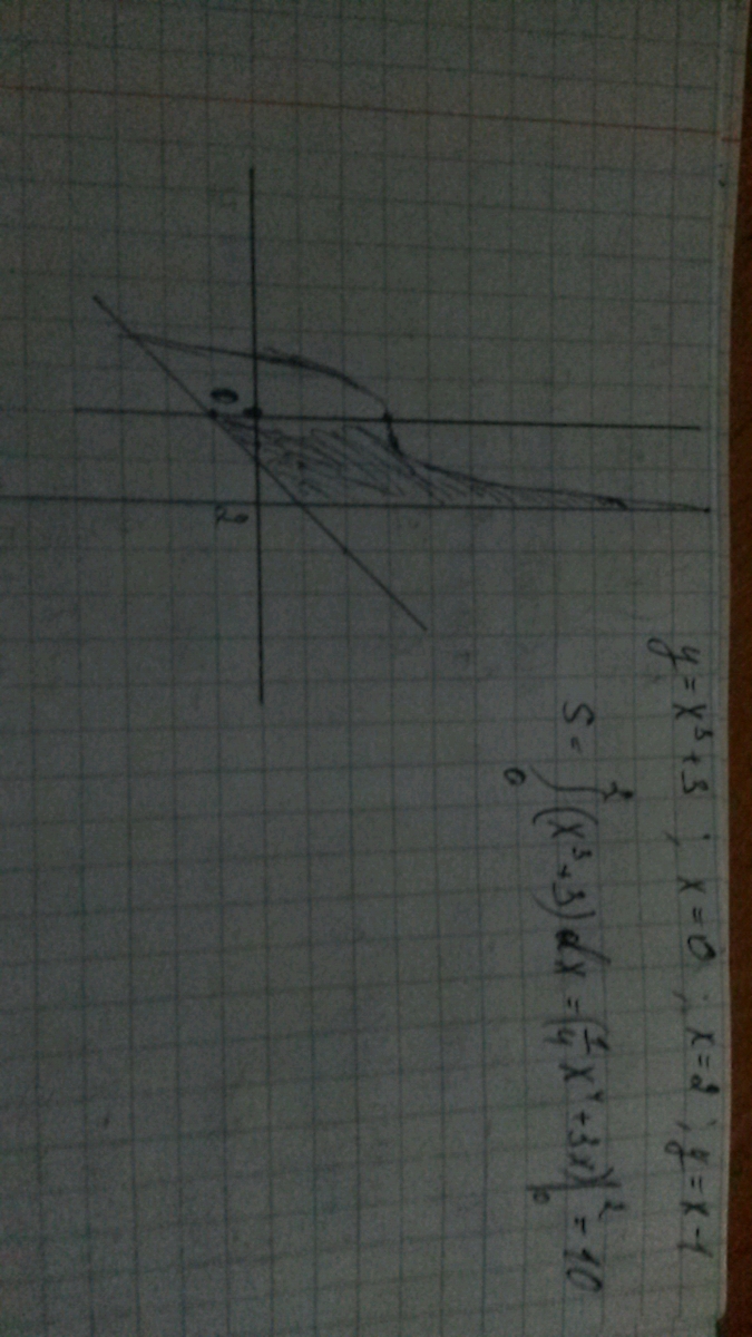 Вычислить площадь плоской фигуры, ограниченной заданными кривыми. сделать чертёж области. Y=X в кубе+3, X=0 , Y=X-1 , X=2.
