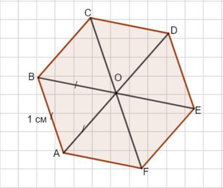 Пусть дан правильный шестиугольник ABCDEF. Если в правильном шестиугольнике провести диагонали AD, BE, CF, то шестиугольник разделим на 6 правильных треугольников со стороной 1 см.