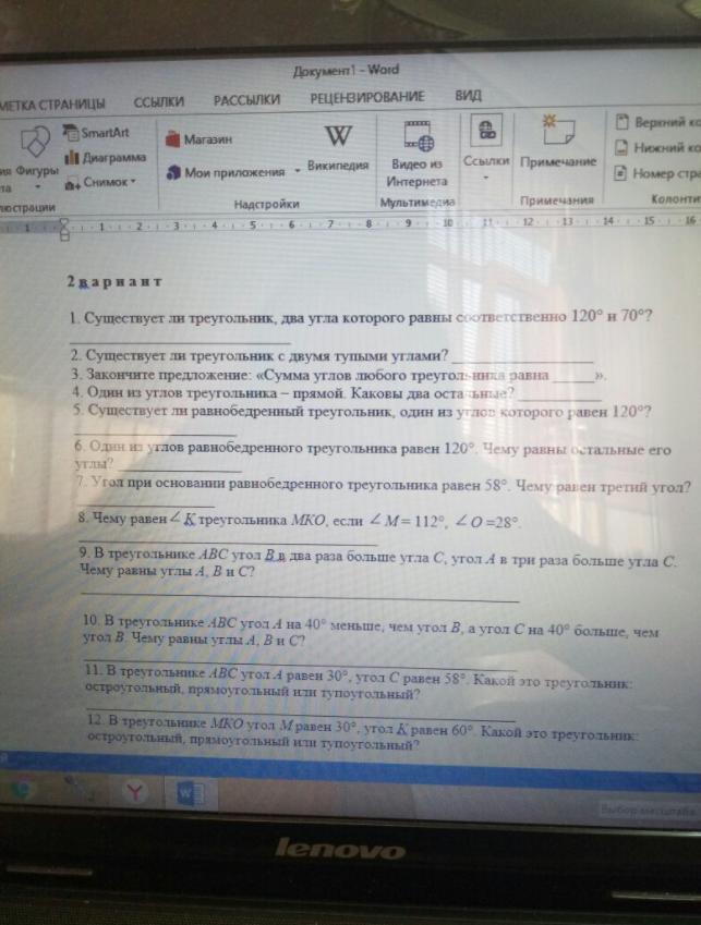 угол С=x B=2x A=3x ;x+2x+3x=180;6x=180 ;x=180÷6 ;x=30 B=60° C=30 A=90 10)B=x A=x-40° C=x+40 x+x-40+x+40=180 3x=180 x=180÷3 x=60° C=60° B=20° C=100° 11)тупокутний 12) прямоугольний