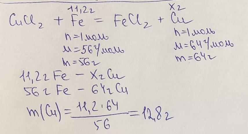 Яка маса міді виділиться якщо з розчином СuCl2 прореагує залізо масою 11,2