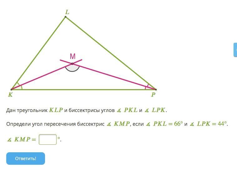 Биссектриса делит угол пополам значит , в треугольнике КМР , угол К=66°/2=33°