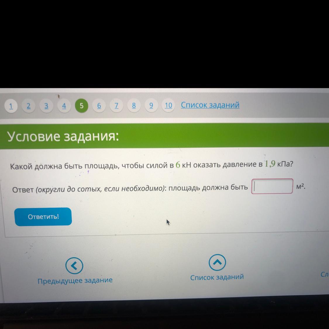 S = F/p = 6 * 10³ / 1.9 * 10³ ≈ 3,16 м²