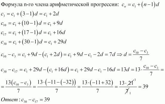 Різниця тридцятого та сімнадцятого членів арифметичної прогресії (cn), якщо c10 =-11, а c3 =-32, це: