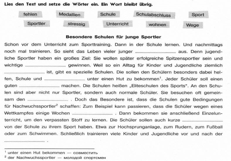 Schon vor dem Unterricht zum Sporttraining. Dann in der Schule lernen. Und nachmittags noch mal trainieren. So sieht das Leben vieler junger Sportler aus. Denn jugendliche Sportler haben ein großes Ziel: Sie wollen später erfolgreiche Spitzensportler sein und wichtige Medaillen gewinnen. Weil so ein Alltag für Kinder und Jugendliche ziemlich stressig ist, gibt es spezielle Schulen. Die sollen den Schülern besonders dabei helfen, Schule und Sport unter einen Hut zu bekommen. Jeder Schüler soll einen guten Schulabschluss machen. Die Schulen heißen „Eliteschulen des Sports“. An den Schulen sind aber nicht nur Sportler, sondern auch normale Schüler. Sie besuchen oft gemeinsam den Unterricht. Doch das Besondere ist, dass die Schulen gute Bedingungen für Nachwuchssportler schaffen: Zum Beispiel kann passieren, dass die Schüler wegen eines Wettkampfes einige Wochen fehlen. Dann bekommen sie anschließend Einzelunterricht, um den verpassten Stoff zu lernen. Die Schüler sollen auch kurze Wege von der Schule zu ihrem Sport haben. Etwa zur Hochsprunganlage, zum Rudern, zum Fußball oder zum Schwimmen. Schließlich trainieren viele Kinder und Jugendliche vor und nach der Schule.