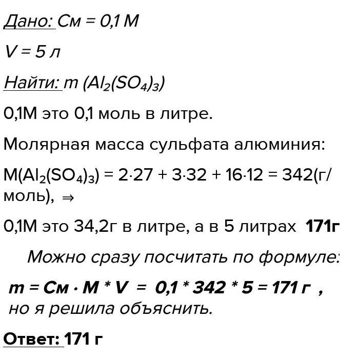 Сколько сульфата алюминия необходимо взять для приготовления 5 л 0,1M раствора этой соли ?