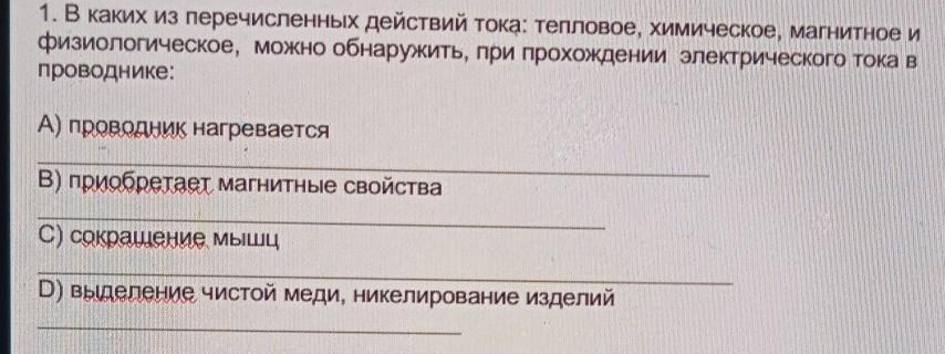 1. В каких из перечисленных действий тока: тепловое, химическое, магнитное и