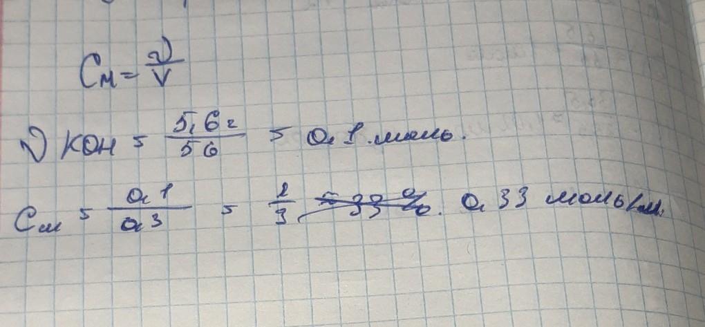 Раствор, объёмом 300 мл, содержит KOH массой 5,6 г. Определить молярную концентрацию этого раствора.
