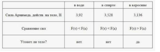 6.Вес тела в воздухе равен 8,5 Н, а его объем - 800 см3. Потонет ли тело в воде; в спирте; в керосине? Заполните таблицу (Плотность воды 1000 кг/м³ , спирта 900 кг/м³ , керосина 800 кг/м³).