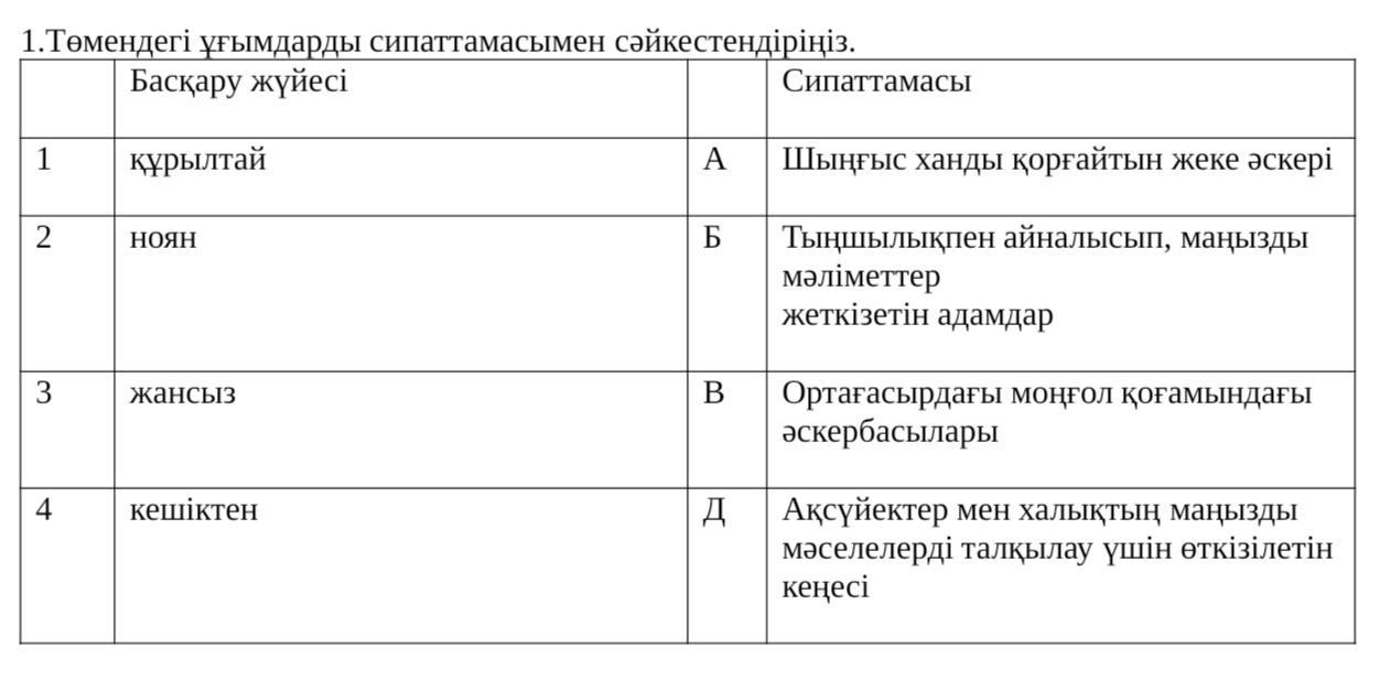 Пж көмектесіндерш қазақстан тарихы төмендегі ұғымдарды сипаттамасымен сәйкестендіріңіз