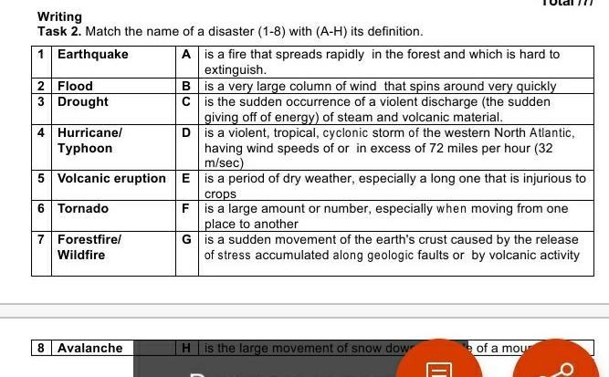 Task.1. match the name of disasters (1-8) with (a-h) its definition.