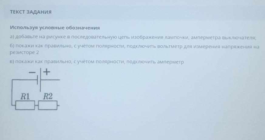 а) добавьте на рисунке в последовательную цепь изображения лампочки, амперметра выключ
