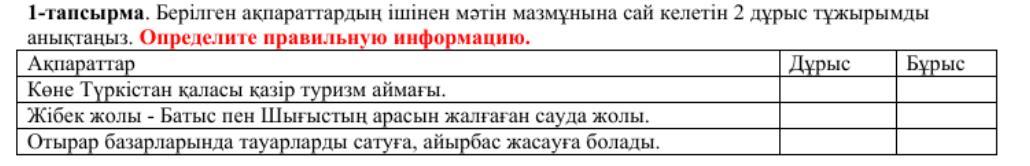 1-тапсырма. Берілген ақпараттардың ішінен мәтін мазмұнына сай келетін 2 дұрыс тұжырымды