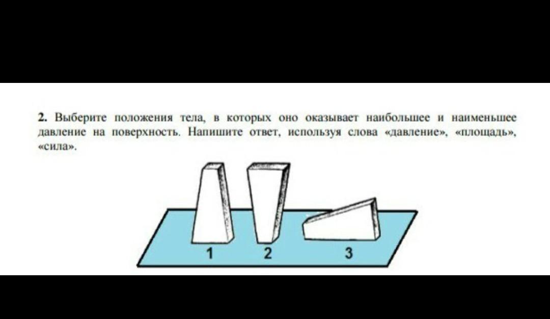 2. Выберите положения тела, в которых оно оказывает наибольшее и наименьшее давление на поверхность. Напишите ответ, используя слова «давление», «площадь», «сила».