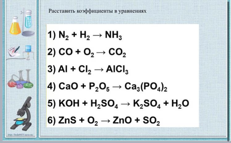 N2+3H2=2NH3. 2CO +O2=2CO2,,. 2Al+3Cl2=2AlCl3.... 3CaO +P2O5=Ca3(PO4)2. 2KOH+H2SO4=K2SO4 +2H2O..... 2ZnS+3O2=2ZnO + 2SO2
