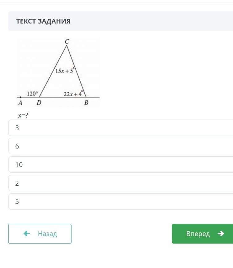 Сумма углов треугольника равна 180°. Поэтому решать надо уравнение, которое будет состоять из суммы всех углов. Угол С = 15х + 5, угол В = 22х + 4, а угол А= 180 - 120 = 60 (поскольку углы ADC и CDB - смежные, их сумма равна 180°