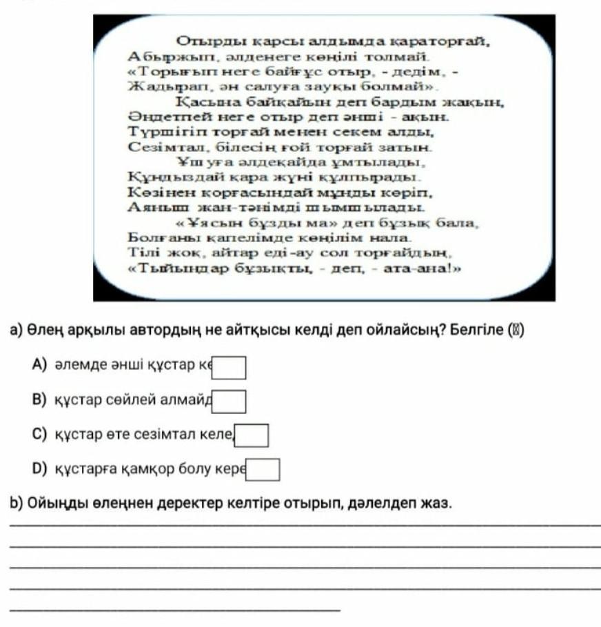 Менің ойымша өлең өте мағыналы . Себебі өлеңде шын өмірдегі оқиға суреттелген . Өлеңде қара торғайдың көңіл-күйі жоқ екені айтылады . Оны мына жолдан мысал келтіре отырып, дәлелдей аламын : көзінен қорғасындай мұңды көріп.... Міне осы жерде торғайдың көңіл күйі жоқ екені айтылған .
