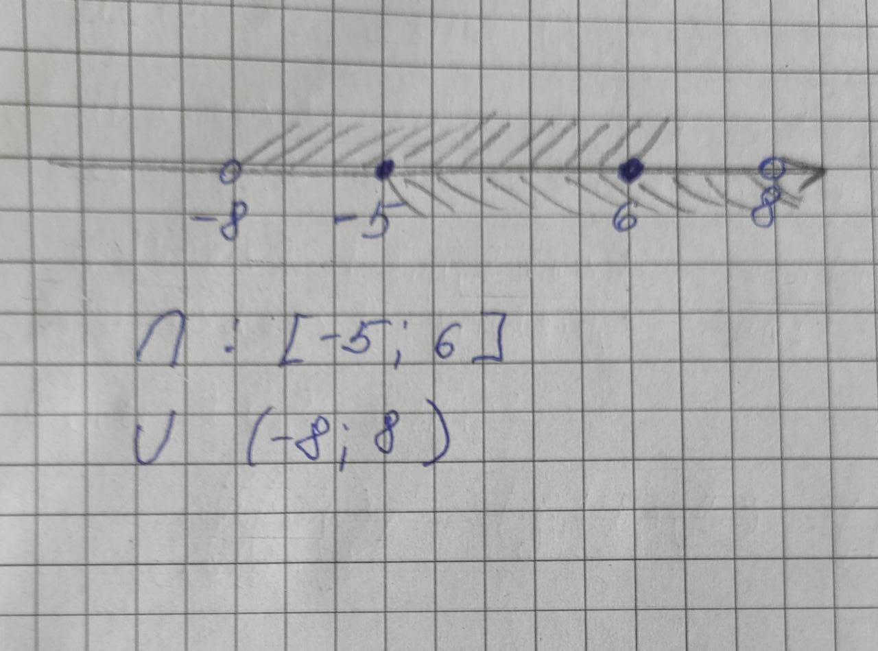 На числовой прямой нарисуйте пересечение и объединение заданных интервалов чисел: (- 8; 6], [-5,8)