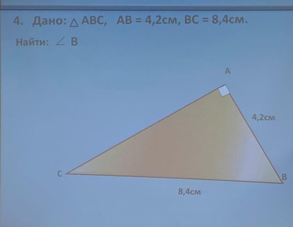 Дано: треугольник abc, AB равно 4,2см , BC равно 8, 4 см .найти угол B.