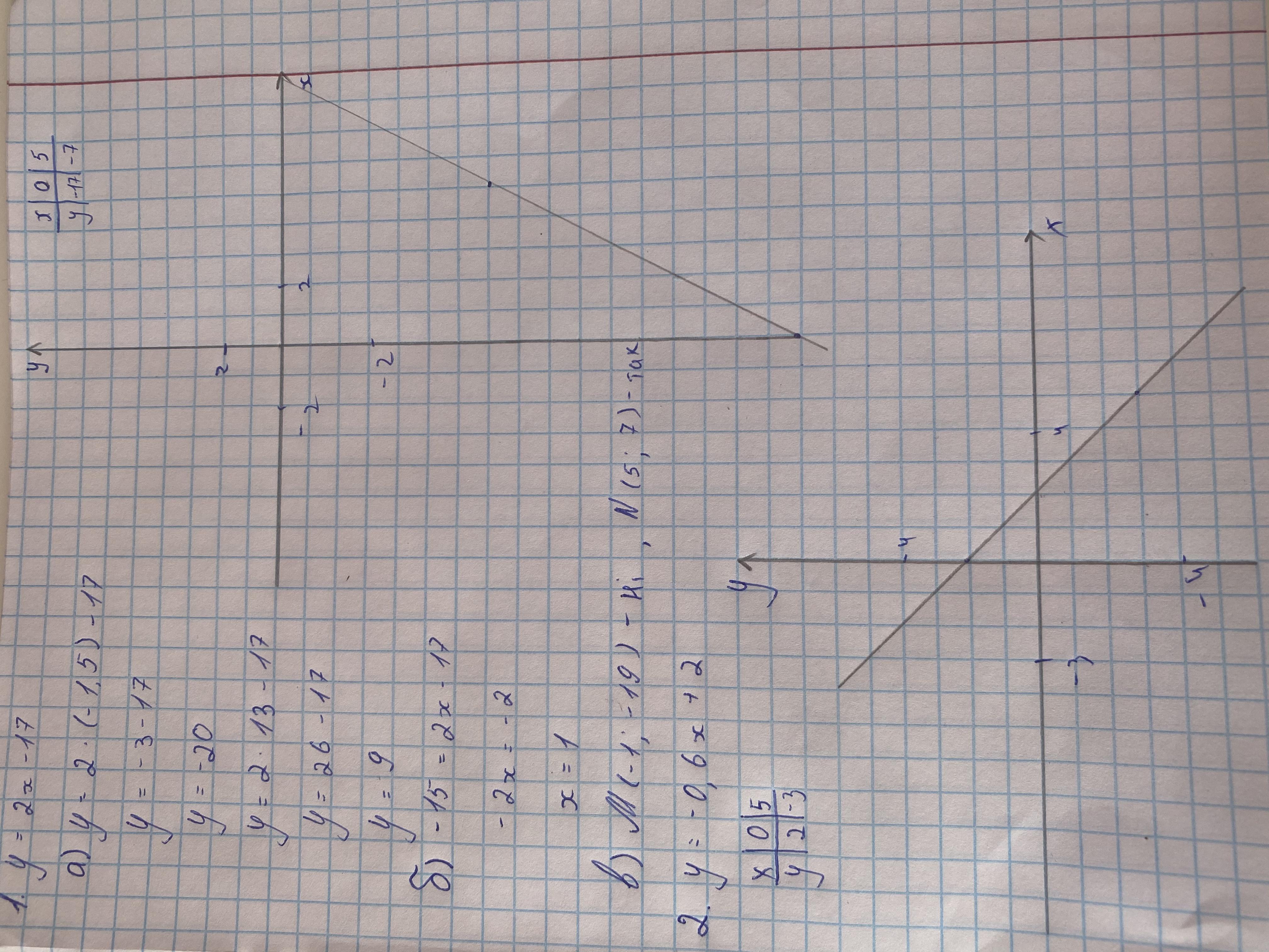 Функцію задано формулою y=2x-17. Чи проходить графік функції через точки M(-1;-19) N(5;7)