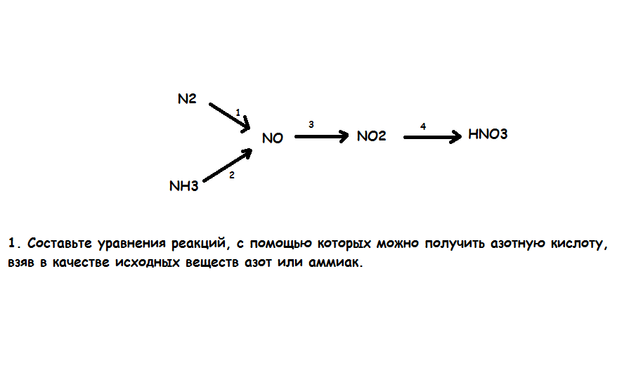 1. Составьте уравнения реакций, с помощью которых можно получить азотную кислоту, взяв в качестве исходных веществ азот или аммиак.